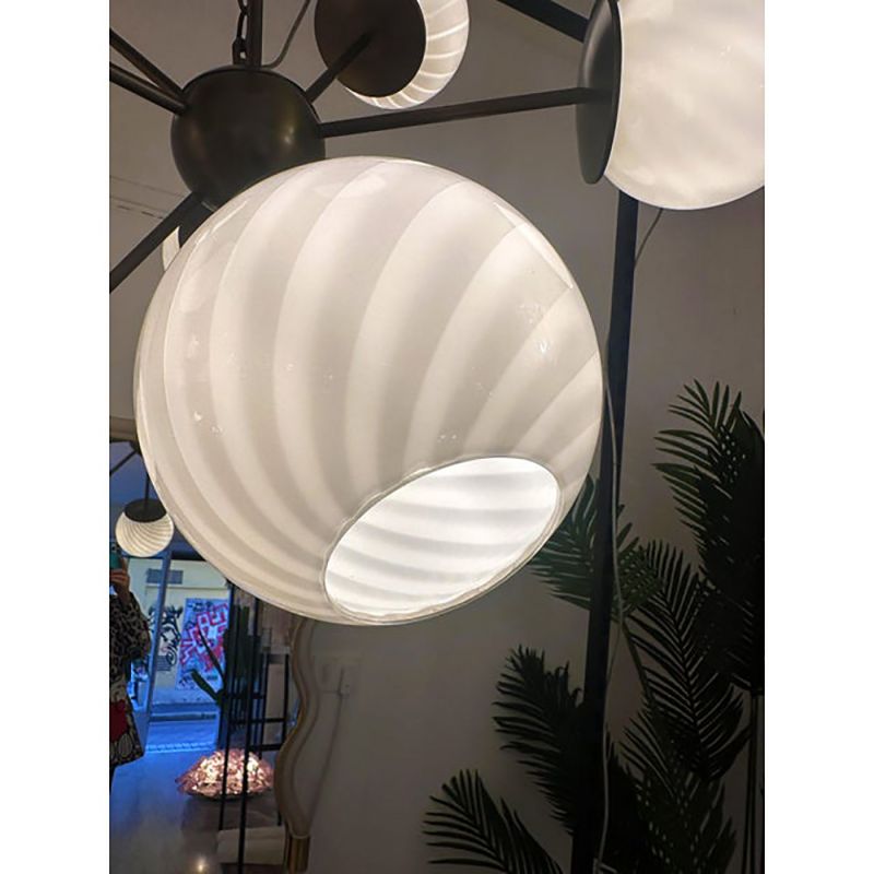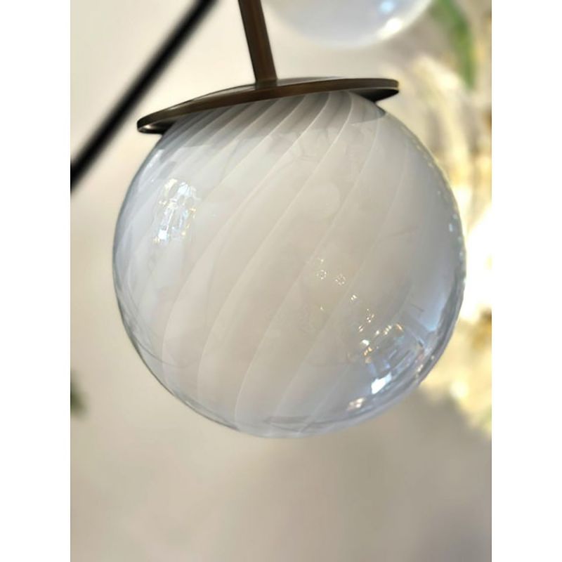 It is a very sparkling chandlier. The diffuser spheres are blown in milky-white with the traditional working tecnique of Murano glass called "rigadin ritorto".