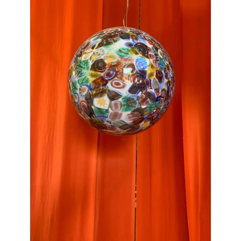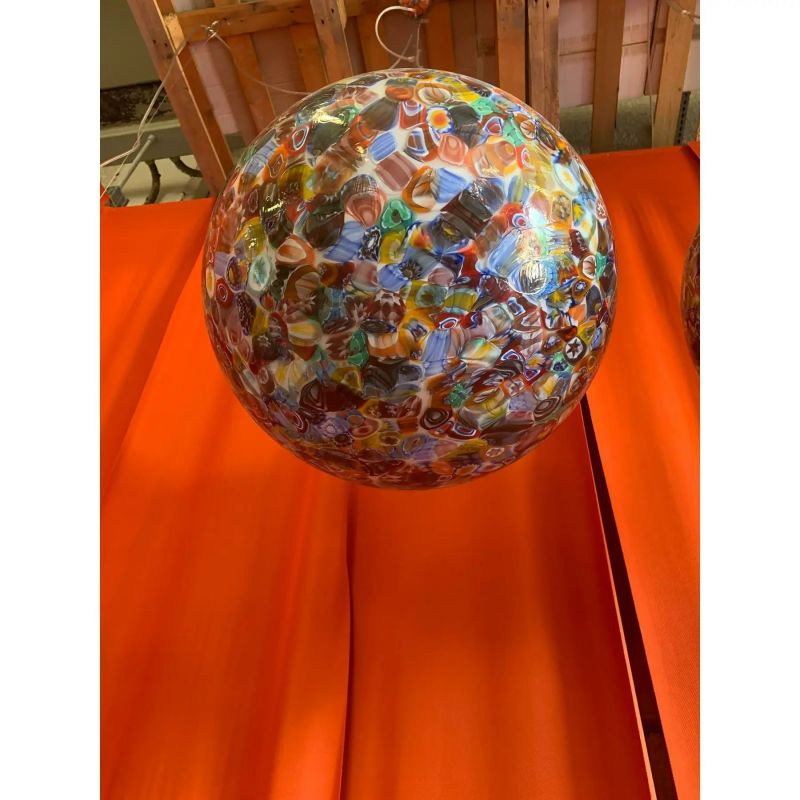 Impressive contempoarary murrine multicolors sphere in Murano glass with multicolored Murrine. Floral design in very particular and effective movement. Very High Italian craftsmanship. Venetian murrine and multicolored millefiori make up this scenographic suspension lamp.These jewels melted together are skillfully blown by skilled Murano masters, Ambient and shenogasphic interior light. Chromed metal frame for 1 bulb. Ships from Italy. D 30cm/11.8"