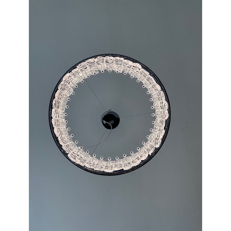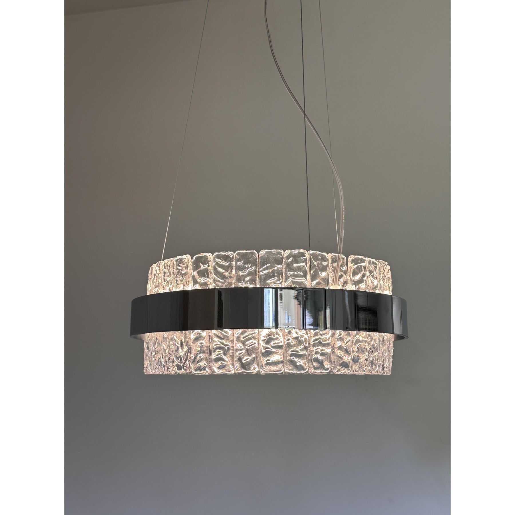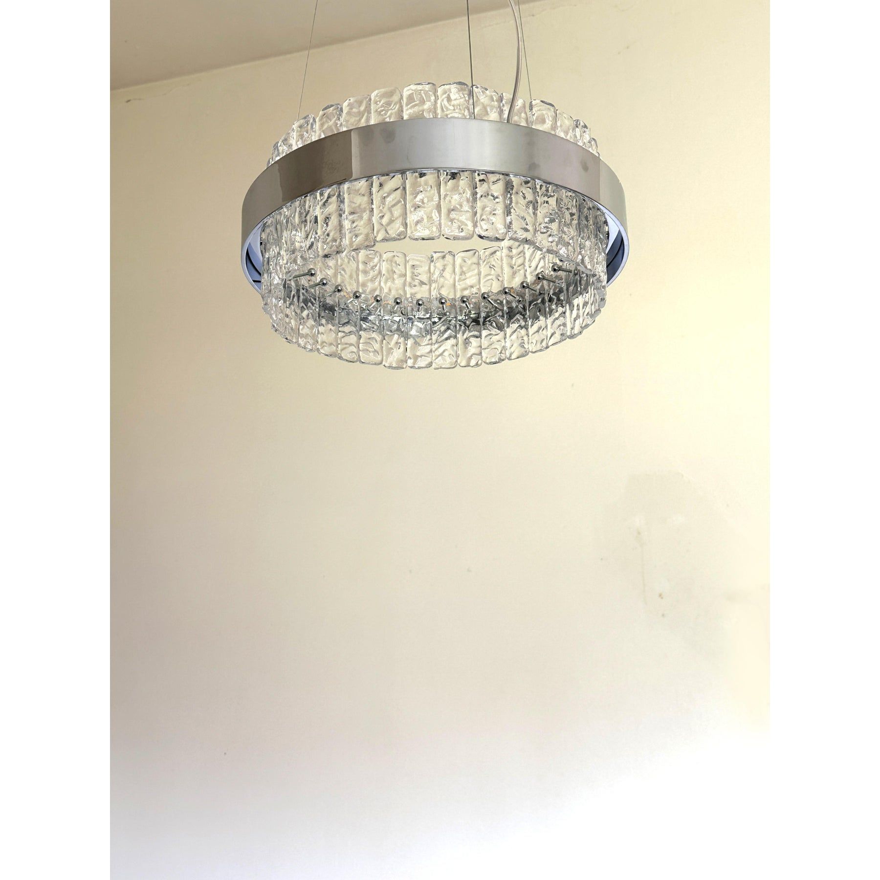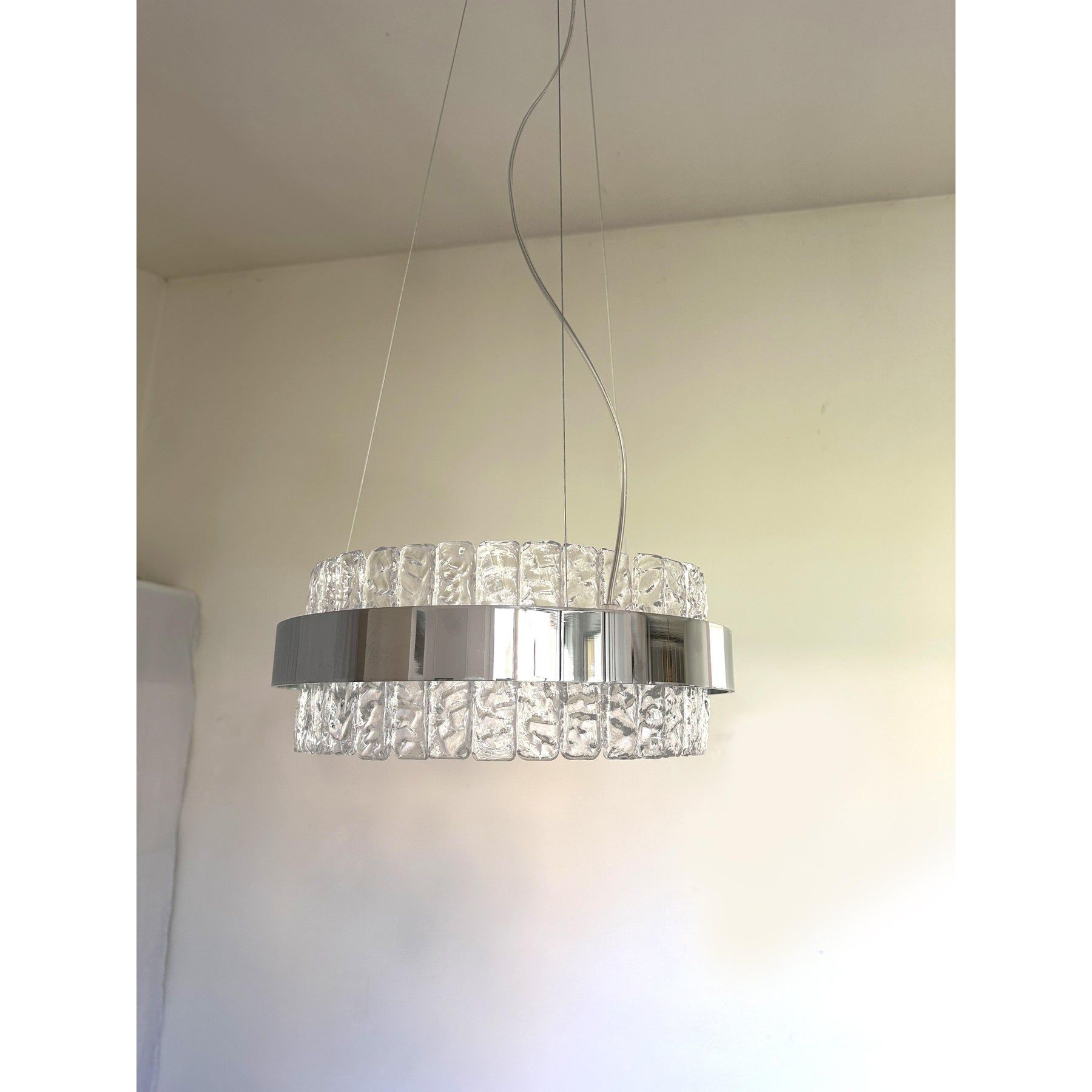 Contemporary polished kromo ring chandelier with hammered clear "Ice" Murano glass With Strip Led.