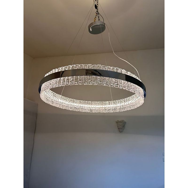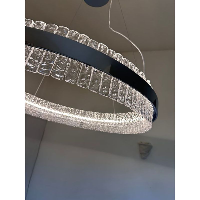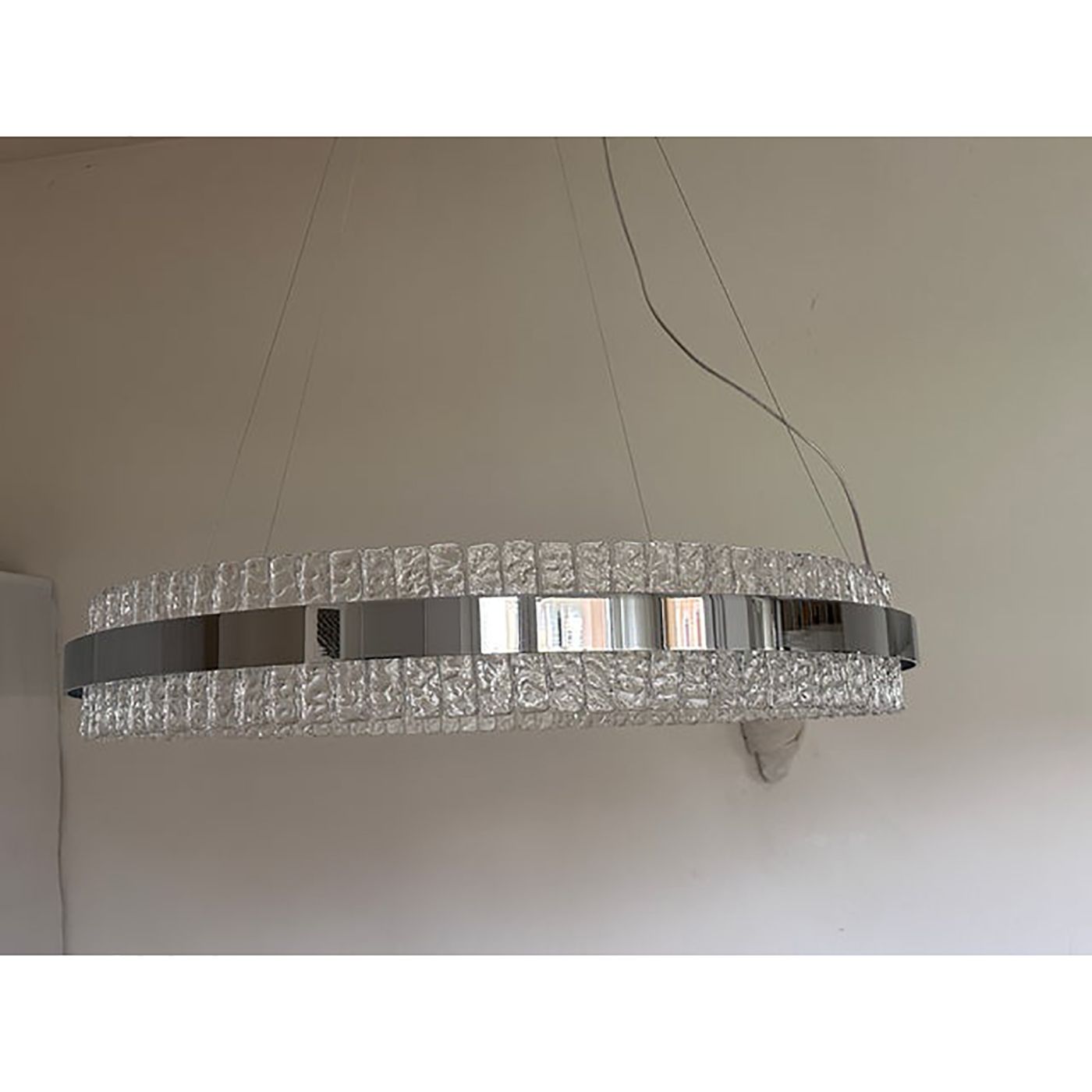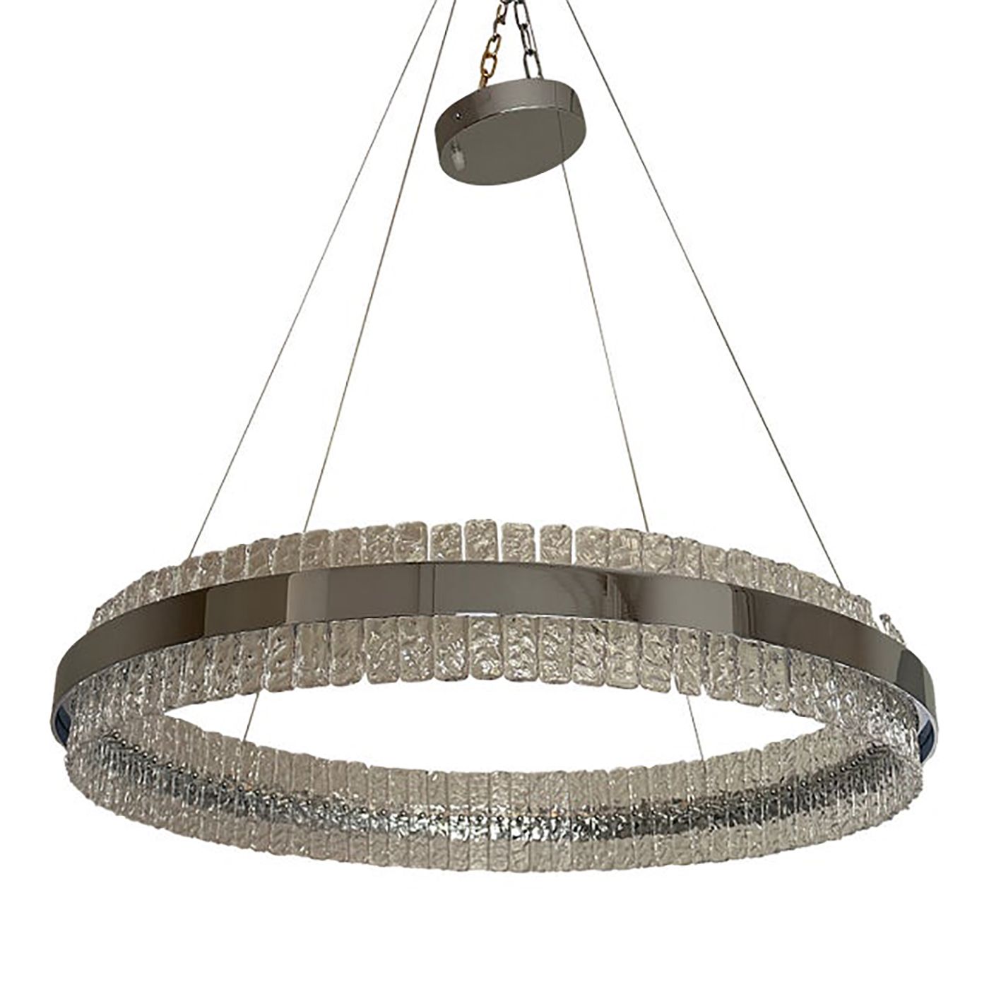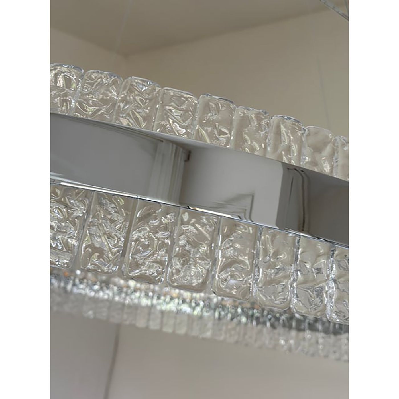 Contemporary polished kromo ring chandelier with hammered clear "Ice" Murano glass With Strip Led.