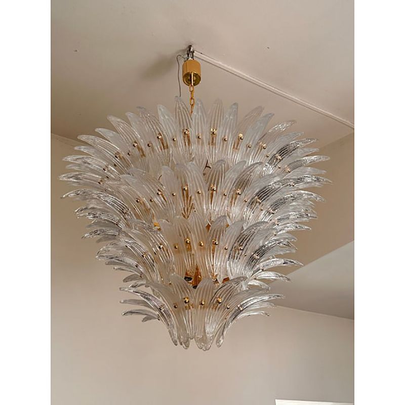 Scenographic chandelier made with "palmette" elements of tradition of Murano glass. tranparent and sanded that give a bright movement of light.