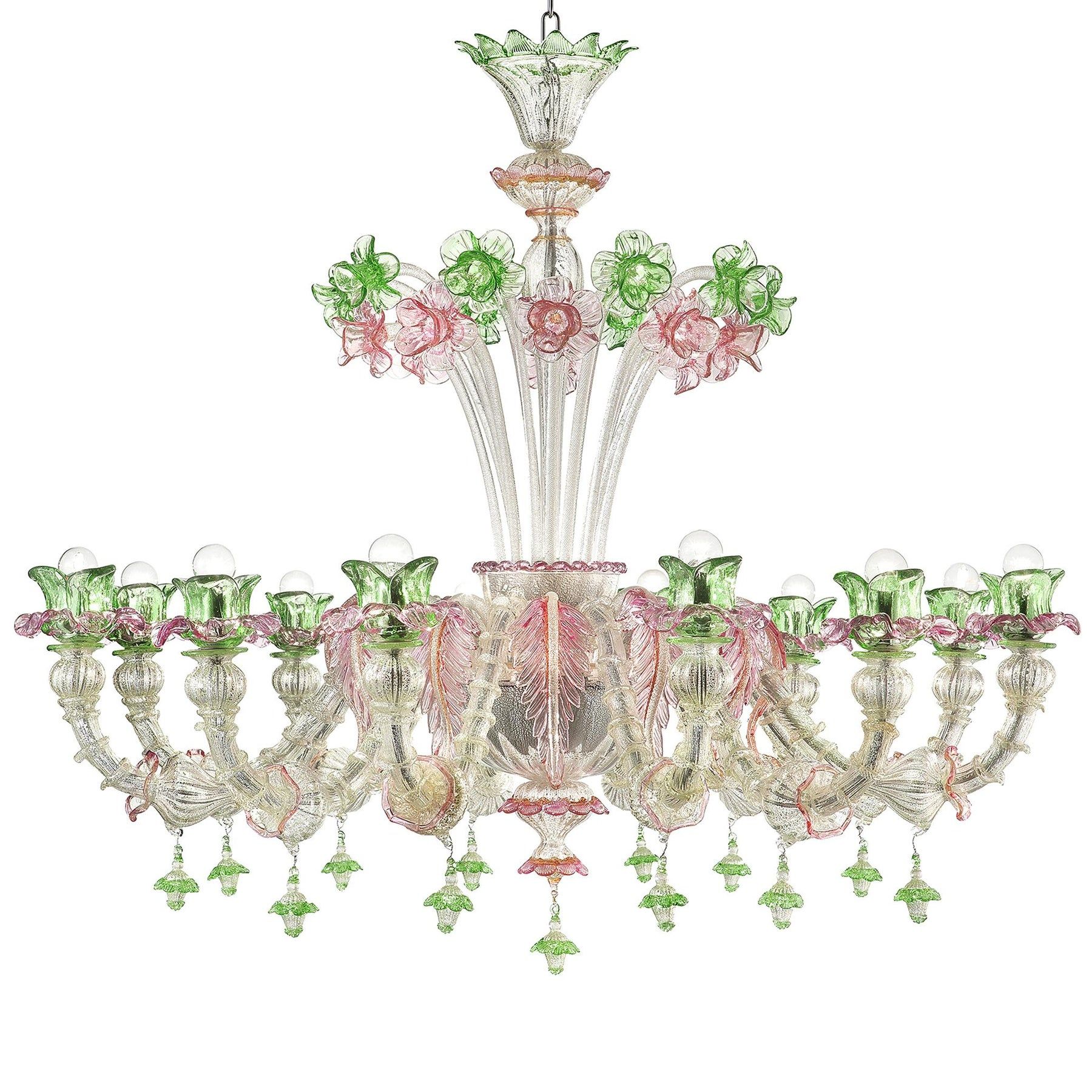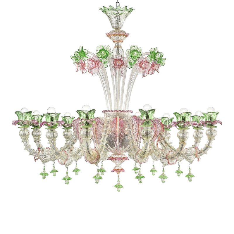 Venetian Romantic pink and green Floreal "cà Rezzonico" Chandelier in Murano glass.