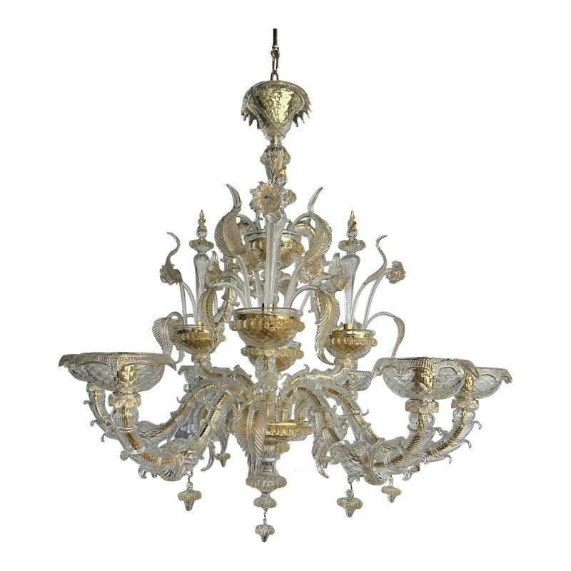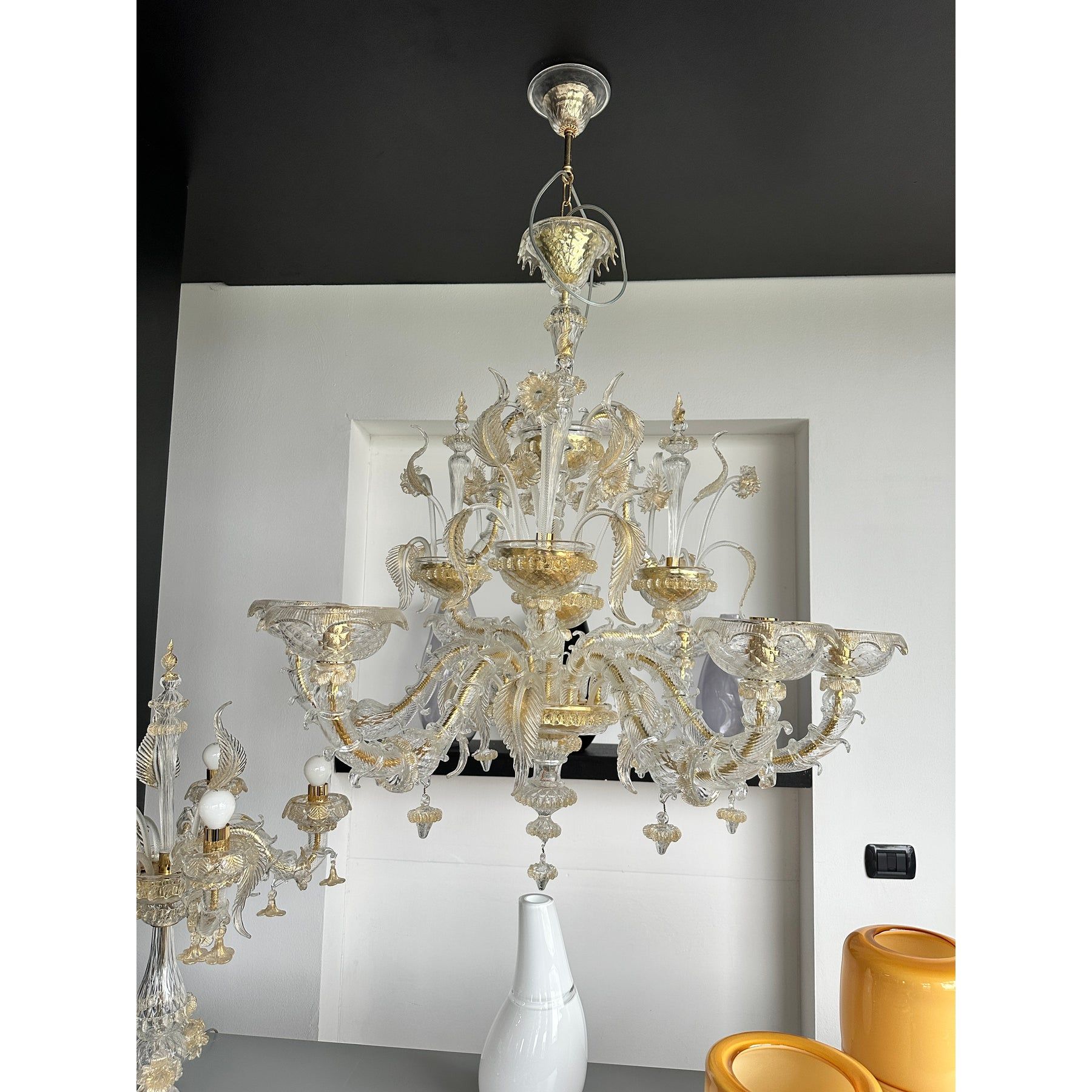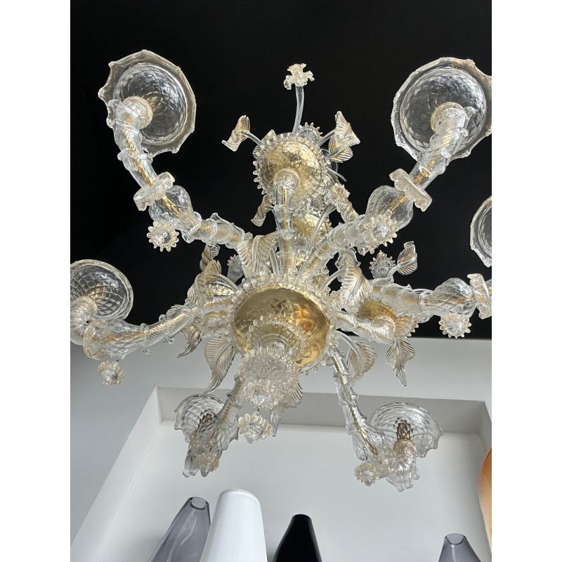 Classical Transparent Murano glass chandelier with flowers and leaves, full of gold-leaf inside.