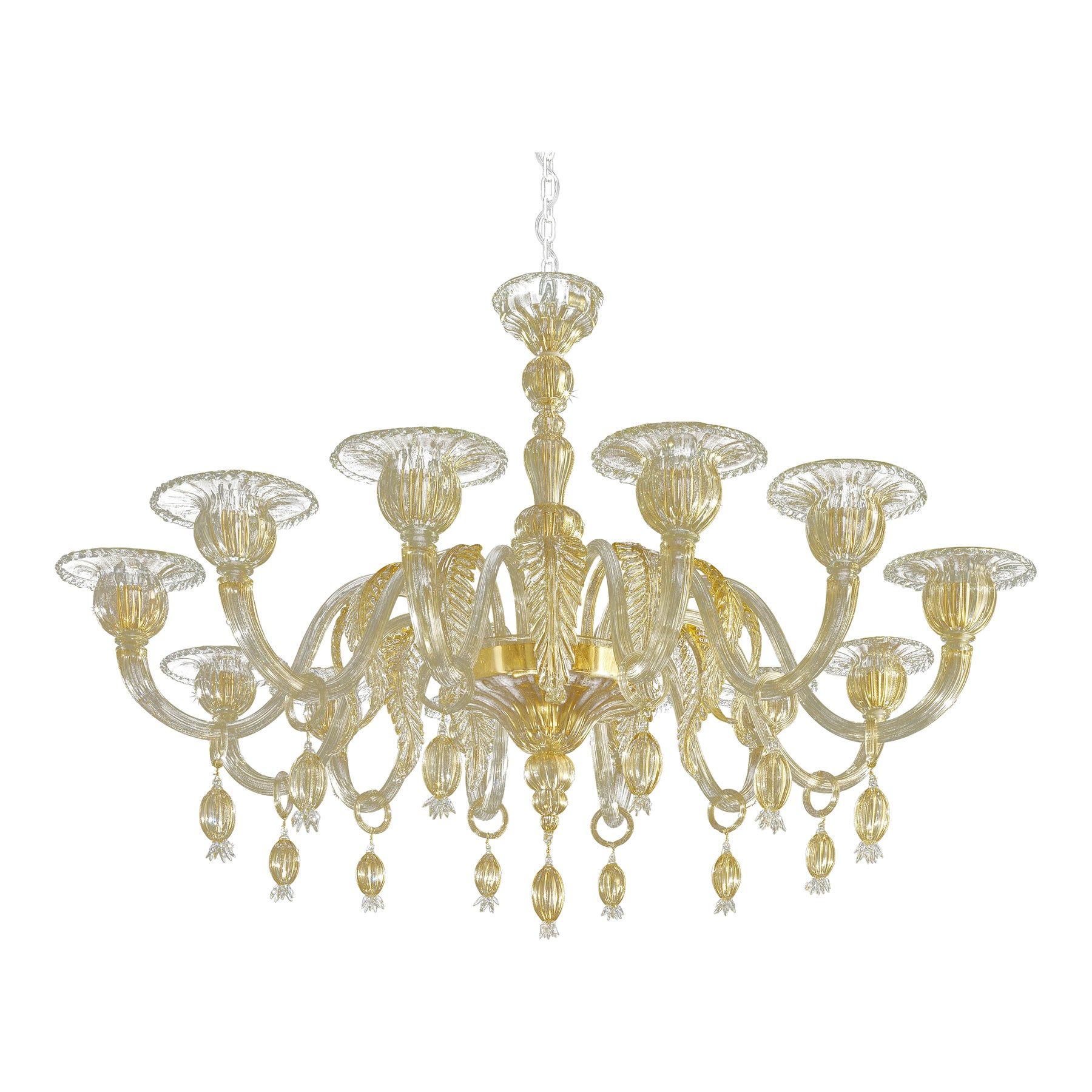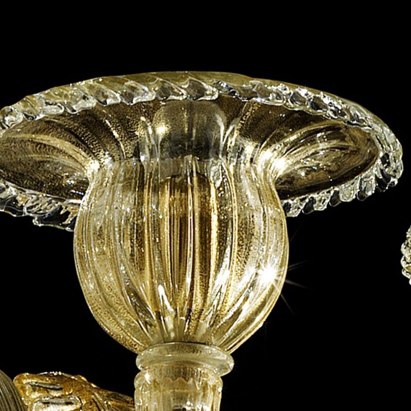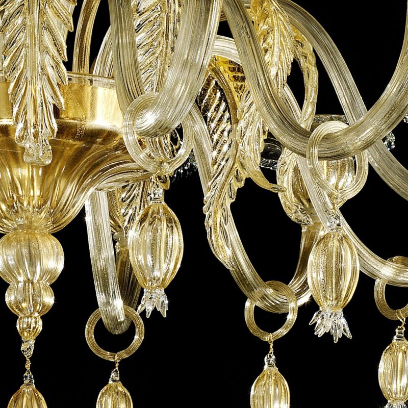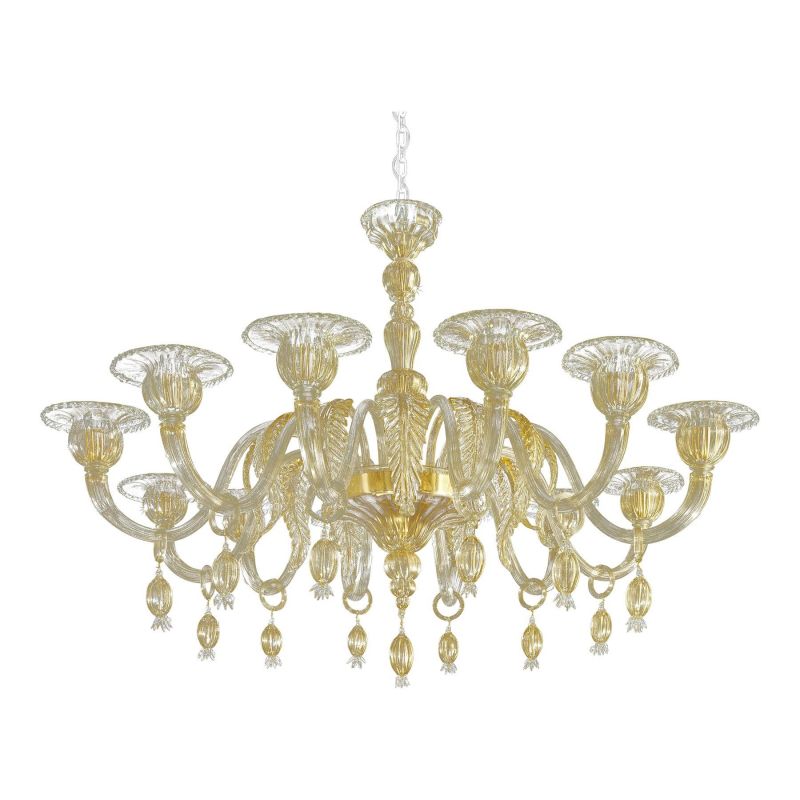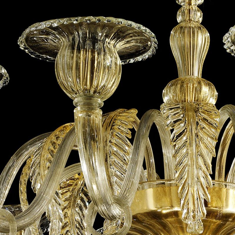 Elegant chandelier in transparent and gold Murano glass and gold metal frame.