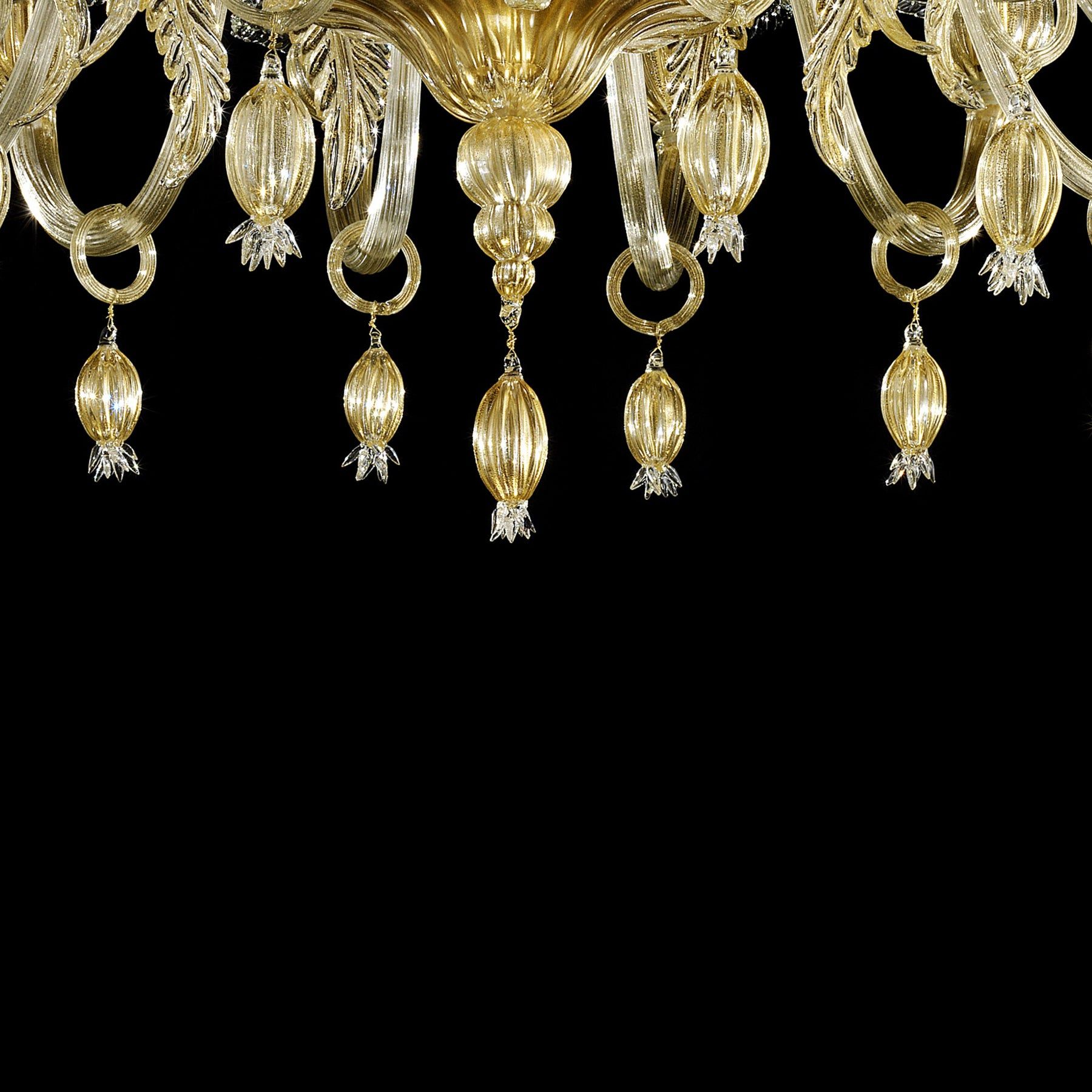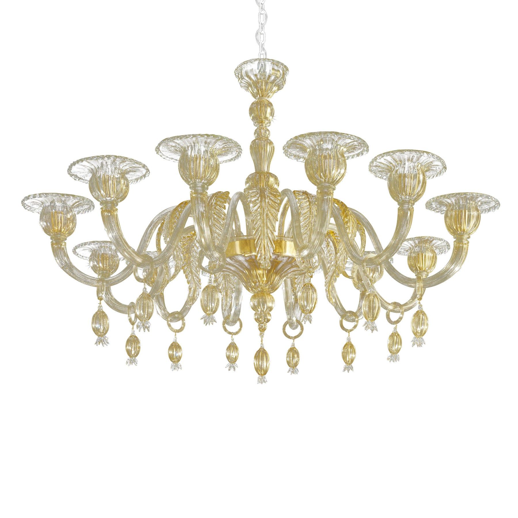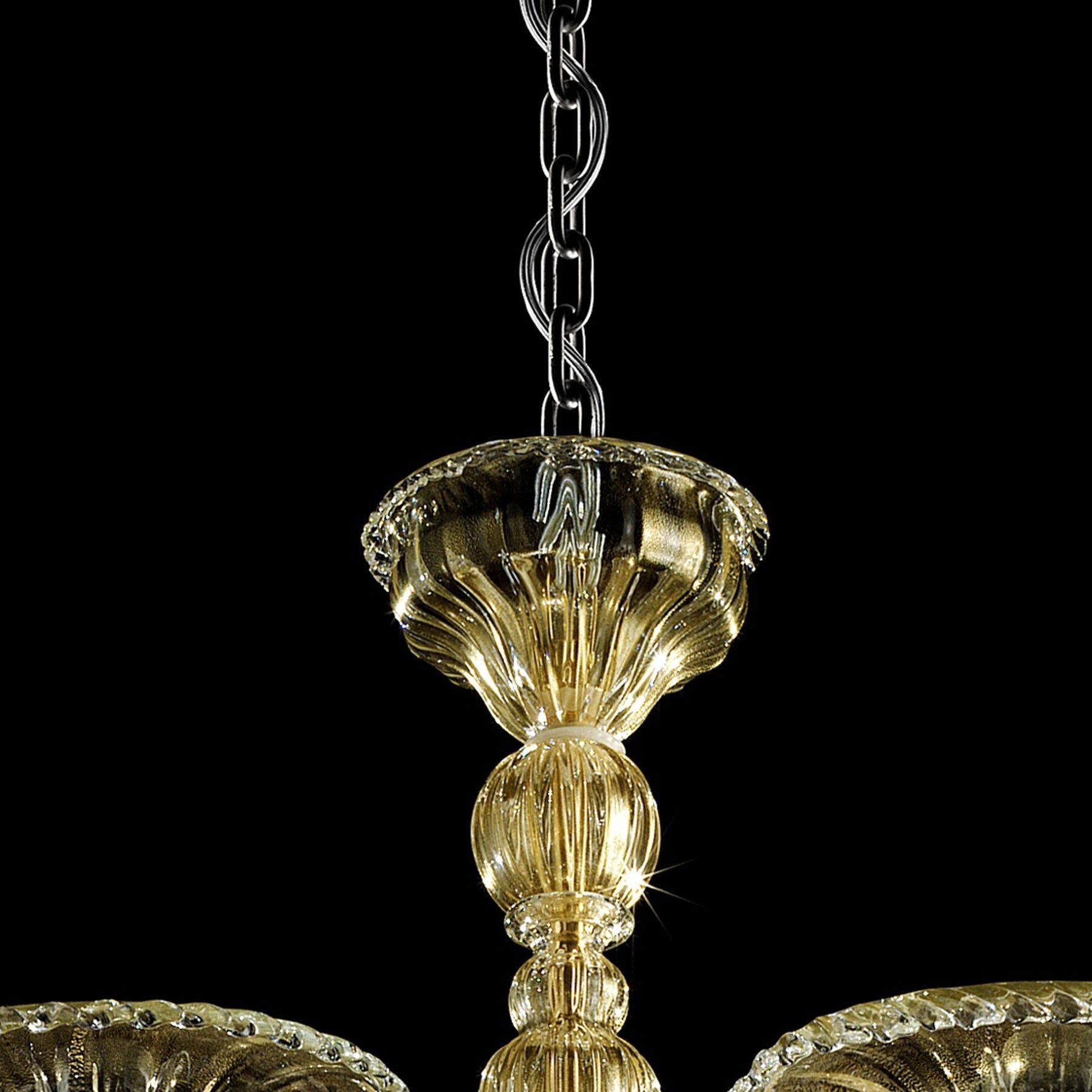 Elegant chandelier in transparent and gold Murano glass and gold metal frame.