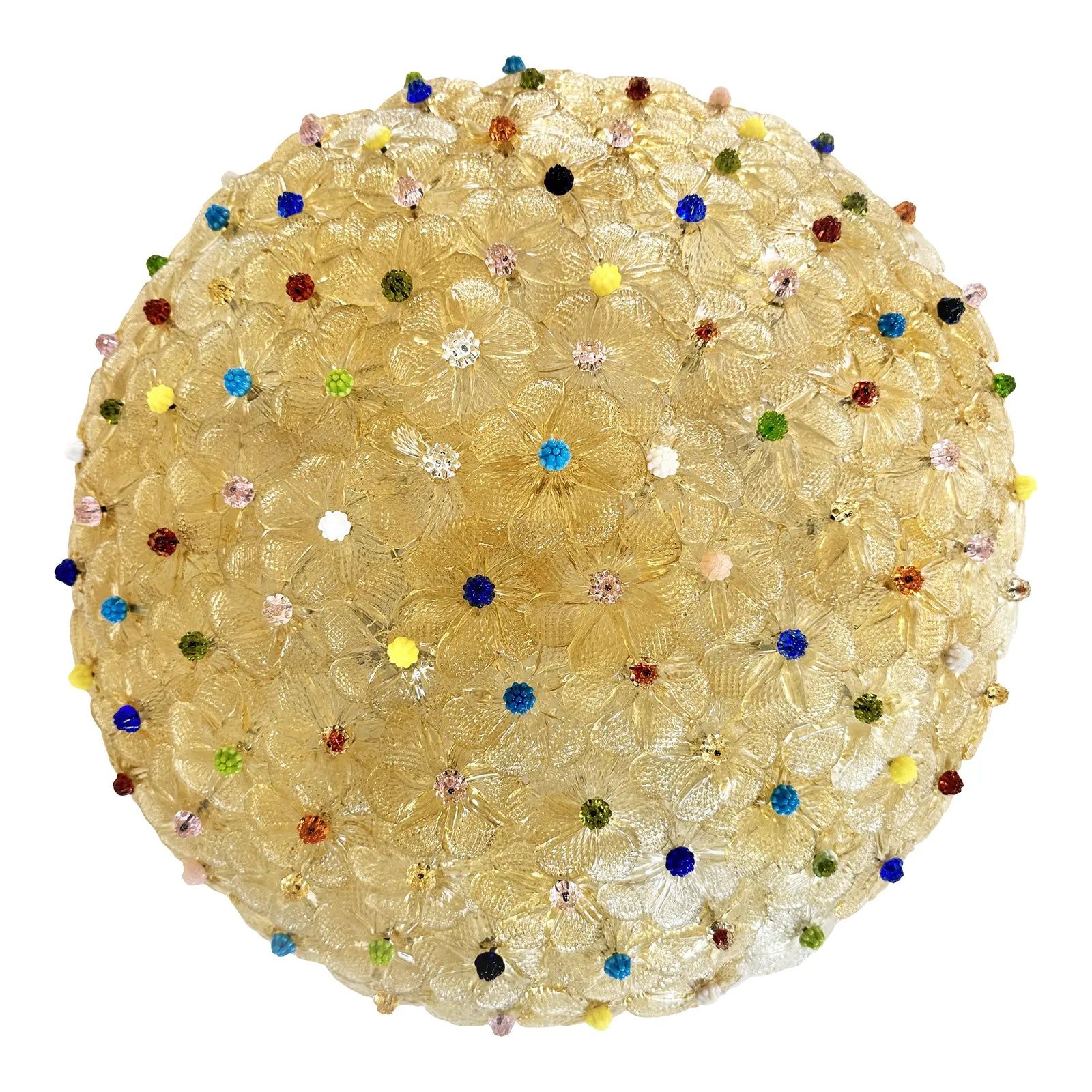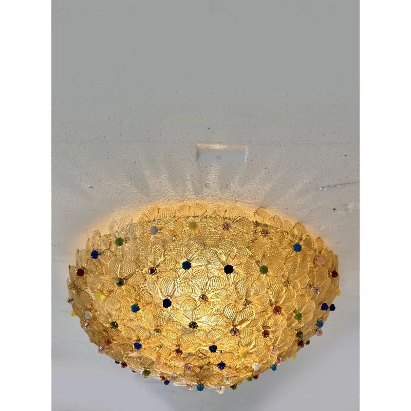 Traditional venetian flush mount with little flowers full of gold-leaf and multicolored pistils in Murano glass.