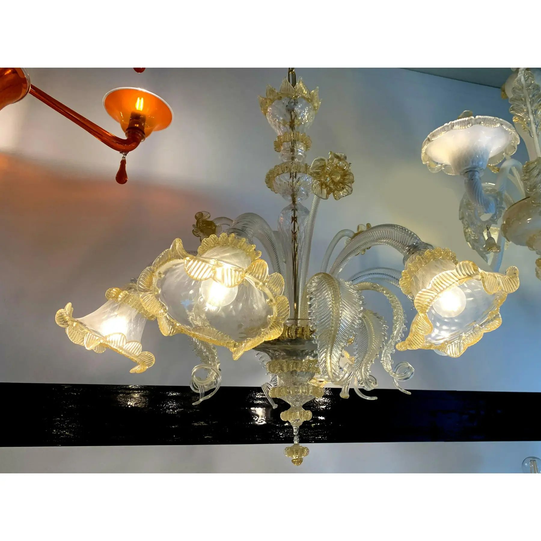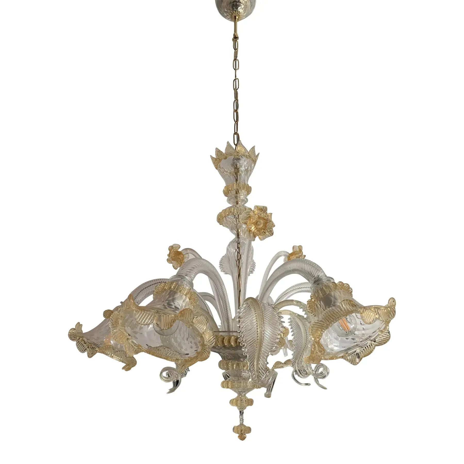 Classical Transparent and gold Murano glass chandelier with flowers and leaves.