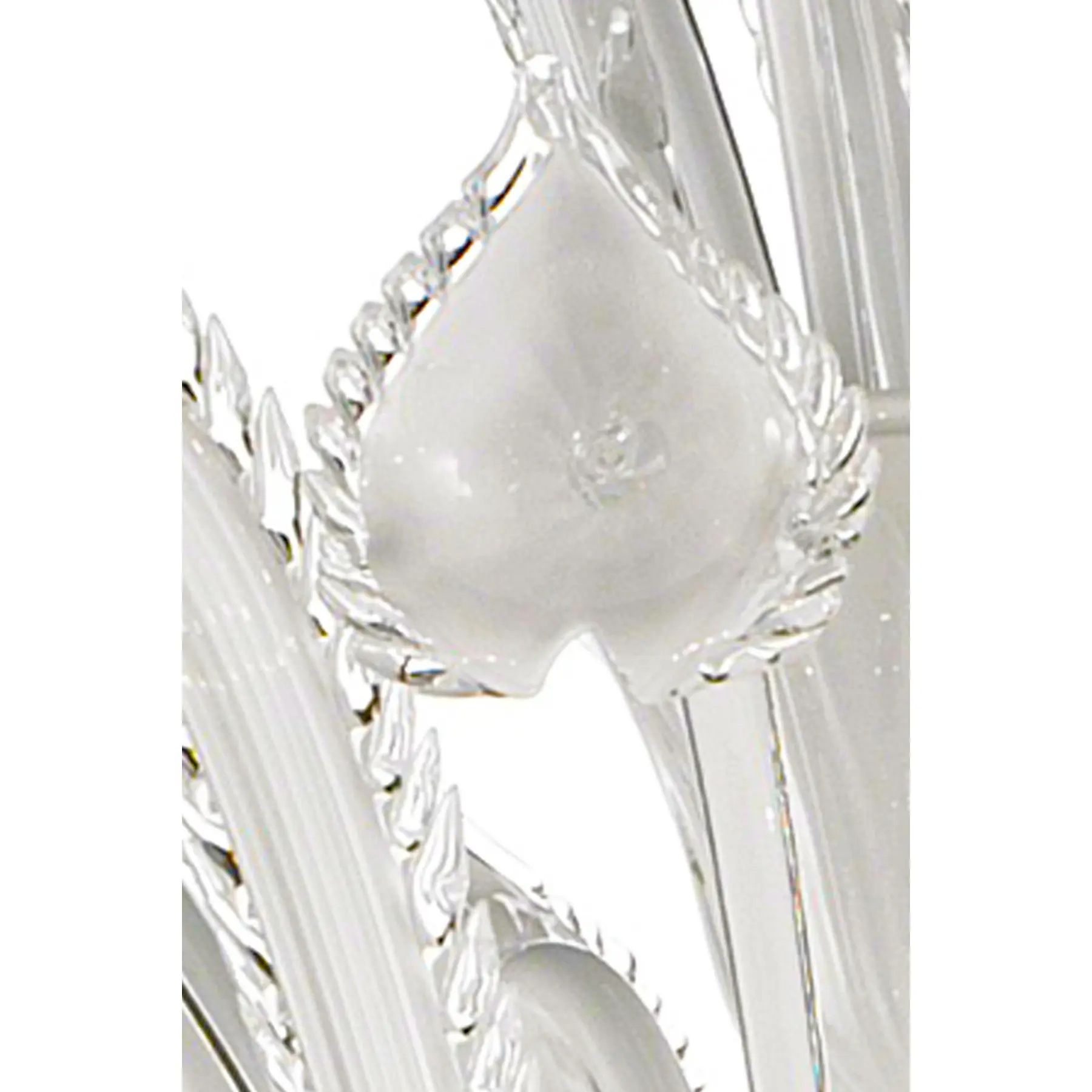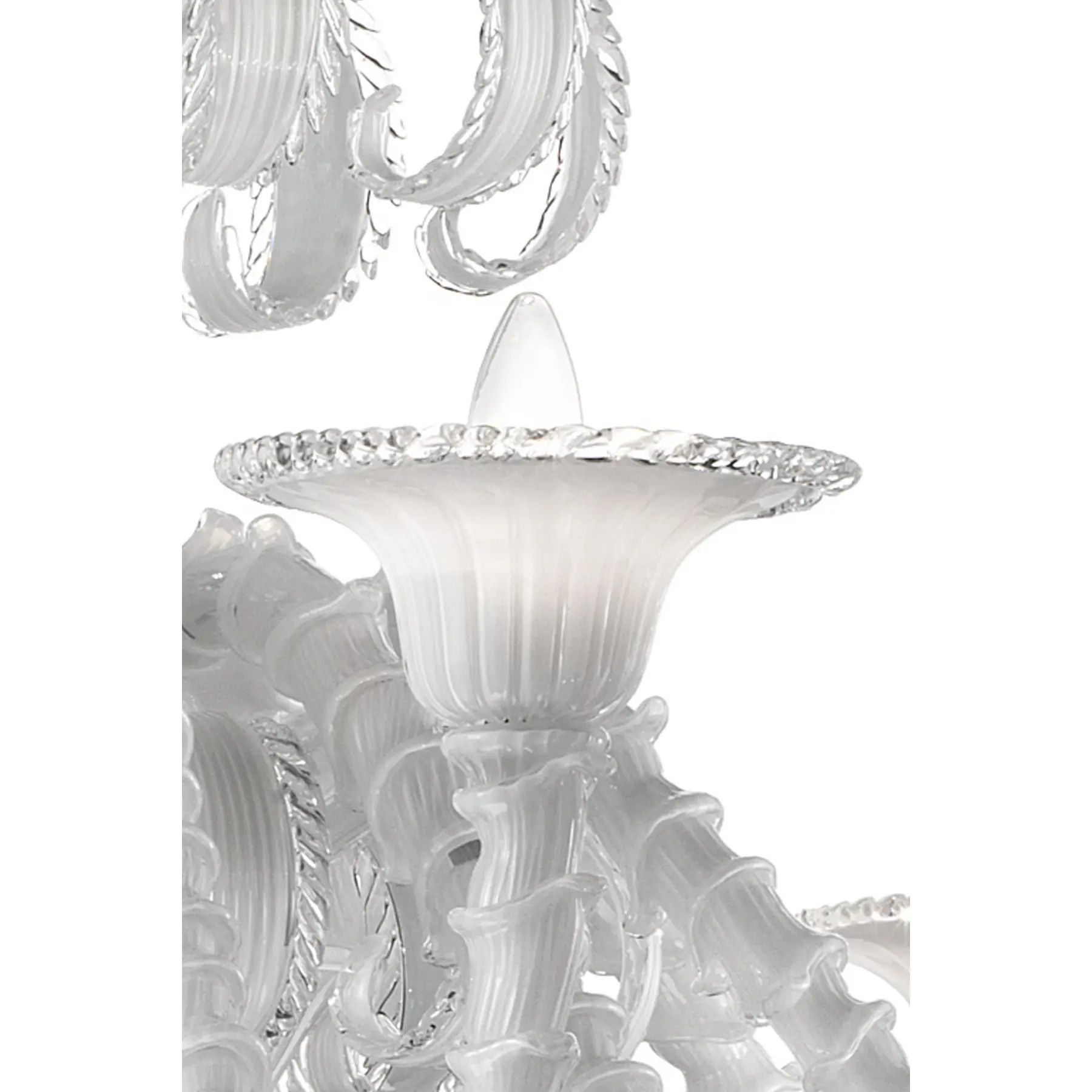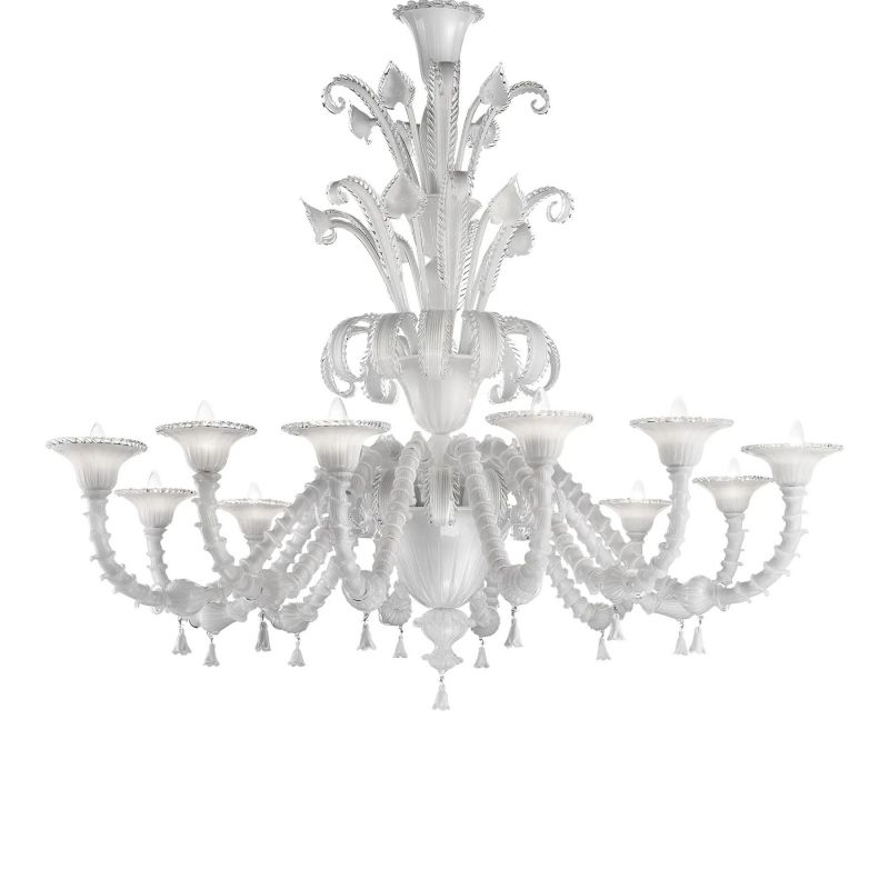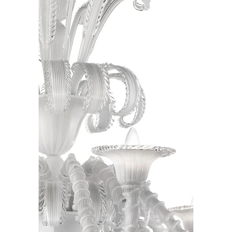 Venetian white “Ca’ Rezzonico” Murano glass chandelier whit trasparent hand-made pinced trimming. For traditional and contemporary interiors.